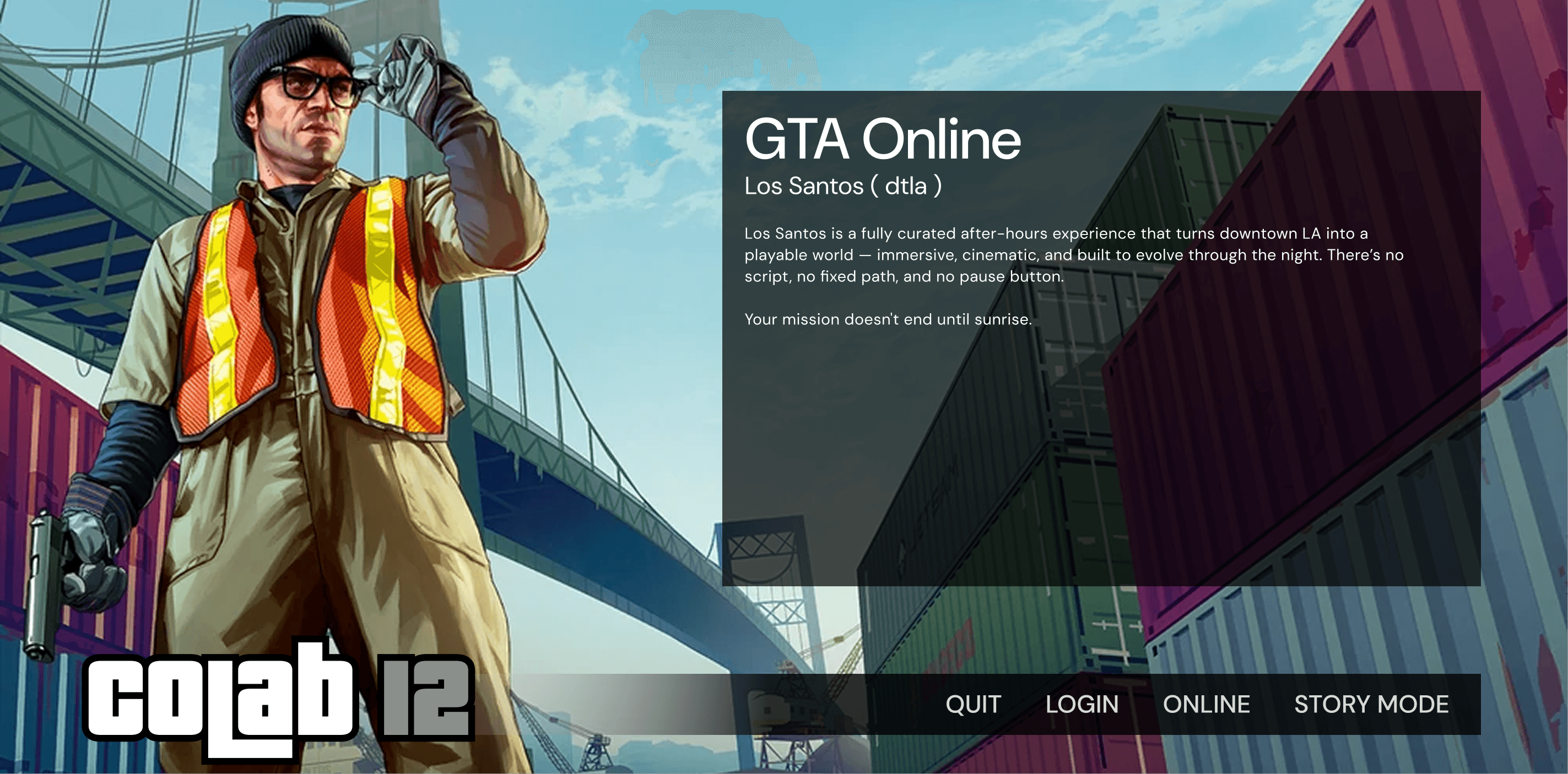 Welcome to Los Santos. A NYE after-hours experience set in downtown Los Angeles — designed to feel like stepping inside a living video game. colab curates the sound, vibe, movement, and atmosphere, pulling you into a continuous mission: make it into 2026. Unlike the real GTA, there are no schedules to follow and no fixed objectives — only discovery, momentum, and the feeling that colab is guiding you through Los Santos as the night unfolds. This isn’t a regular afters you attend — it’s a mission you move through.