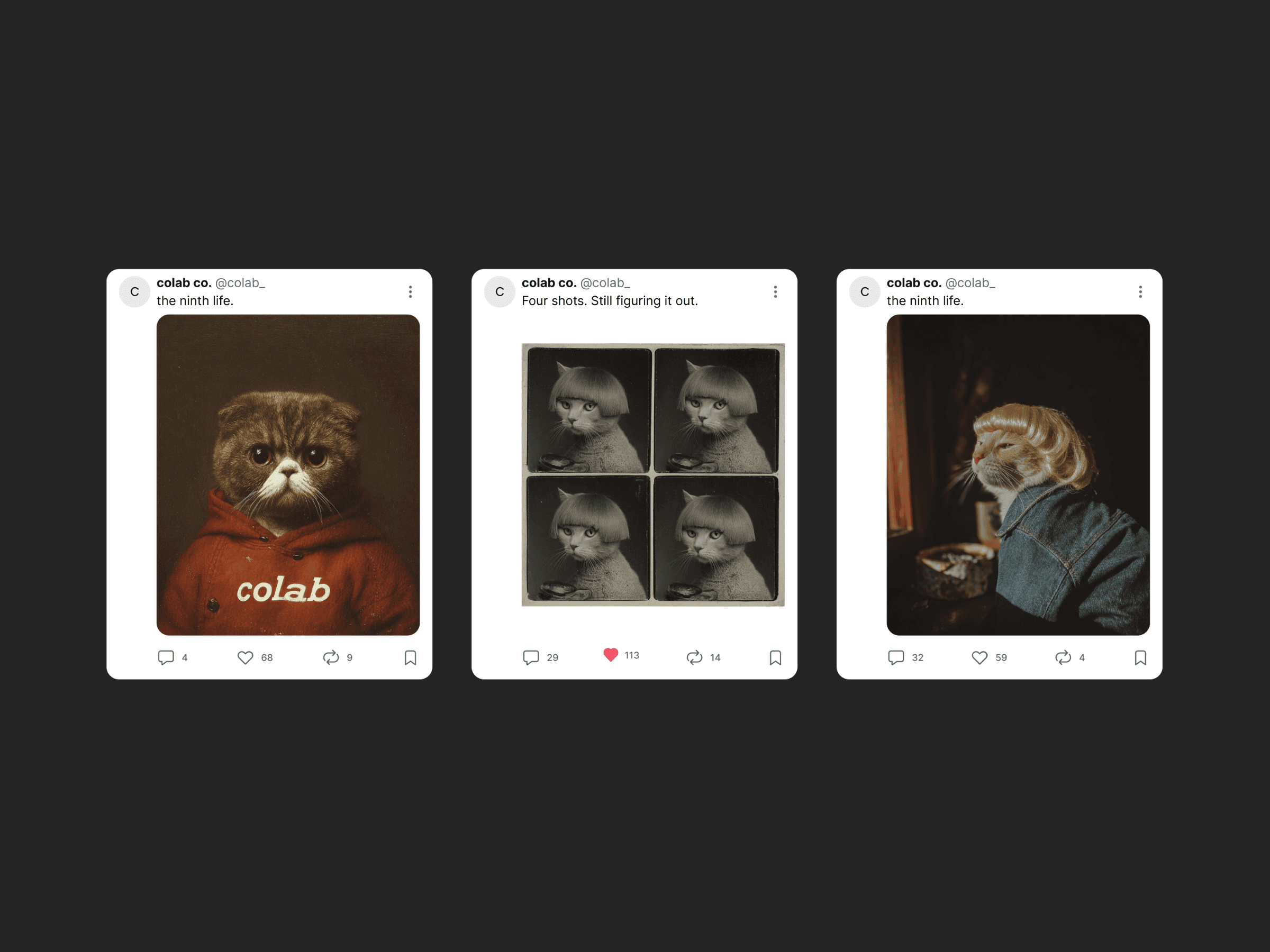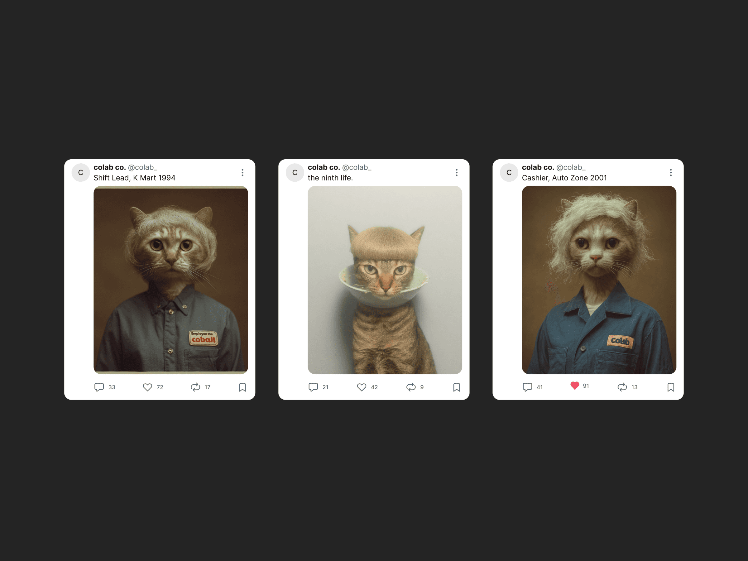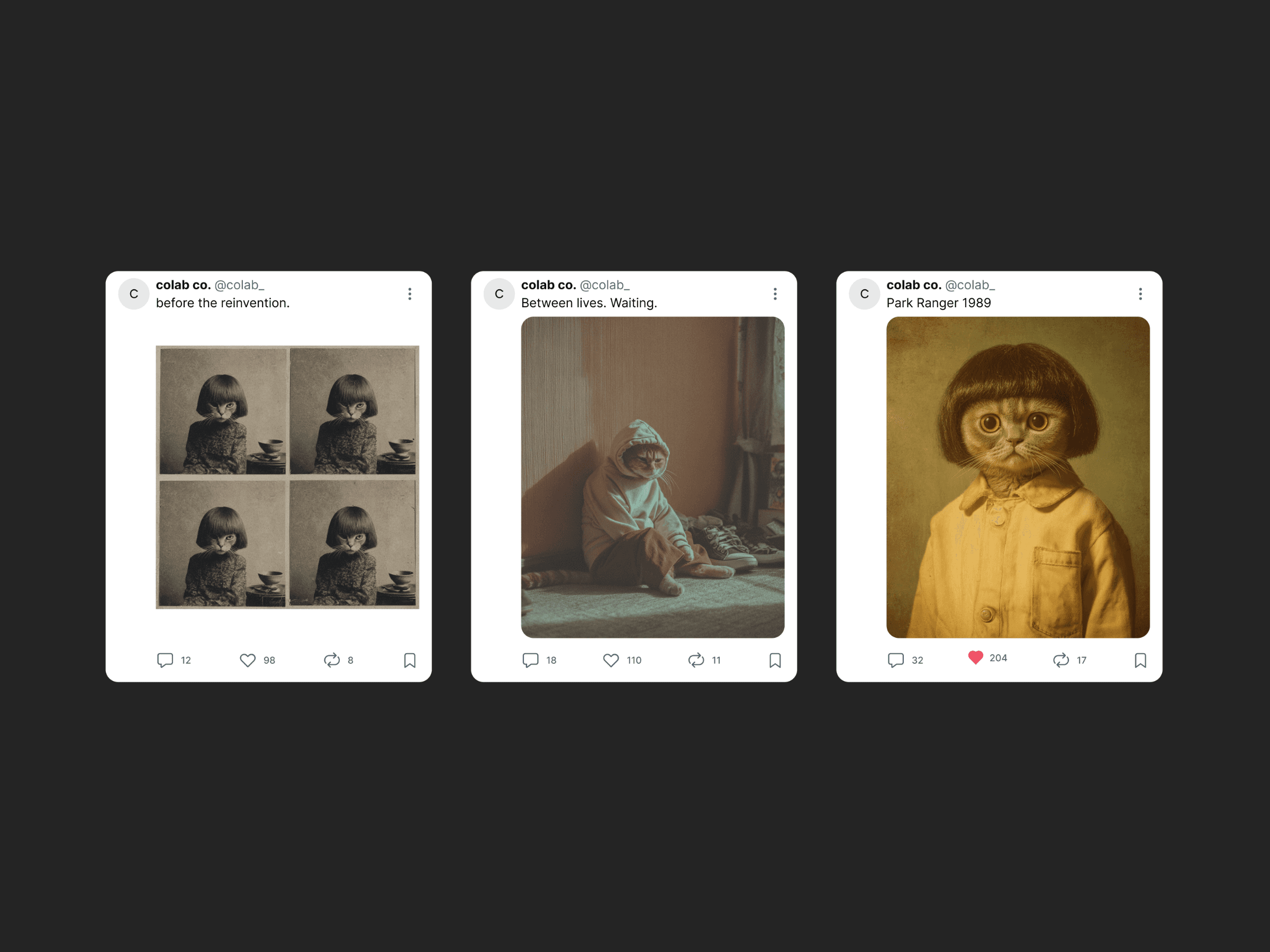 The Ninth Life explores identity through the metaphor that cats have nine lives. If that were true for us, how many versions of ourselves have we already lived? Using structured prompt engineering, each portrait documents a different “life” through realistic, human-like cat archetypes. The visual consistency mirrors continuity of self, while subtle shifts in styling, posture, and expression reflect psychological evolution.